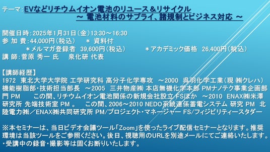 https://cmcre.com/ )では、 各種材料・化学品などの市場動向・技術動向のセミナーや書籍発行を行っておりますが、 このたび「EVなどリチウムイオン電池のリユース&リサイクル ~ 電池材料のサプライ、諸規制とビジネス対応 ~」と題するセミナーを、 講師に菅原 秀一 氏 (泉化研 代表)をお迎えし、2025年1月31日(金)13:30より、 ZOOMを利用したライブ配信で開催いたします。 受講料は、 一般:44,000円(税込)、 弊社メルマガ会員:39,600円(税込)、 アカデミック価格は26,400円(税込)となっております(資料付)。