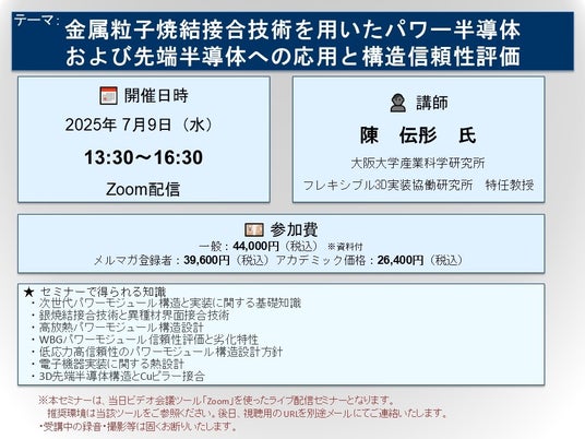 2025年7月9日(水)13:30より、 ZOOMを利用したライブ配信で開催いたします。 受講料は、 一般:44,000円(税込)、 弊社メルマガ会員:39,600円(税込)、 アカデミック価格は26,400円(税込)となっております(資料付)。