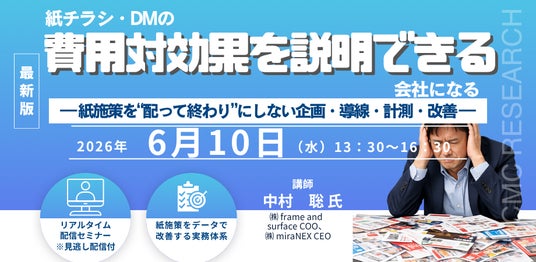 🎓 講師:中村 聡 氏((株) frame and surface COO、 (株) miraNEX CEO) 📆 開催日時:2026年6月10日(水)13:30~16:30🖥️ Zoom配信 + 見逃しアーカイブ配信あり(資料付)💬 テーマ:「紙チラシ・DMの費用対効果を“説明できる”会社になる― 紙施策を“配って終わり”にしない企画・導線・計測・改善 ―」 ――「どれが効いたか分からない」紙施策から脱却。QRコード×導線設計で反響を見える化し、費用対効果を定量把握。勘頼みからデータ起点へ転換する実践ノウハウを具体例で解説。