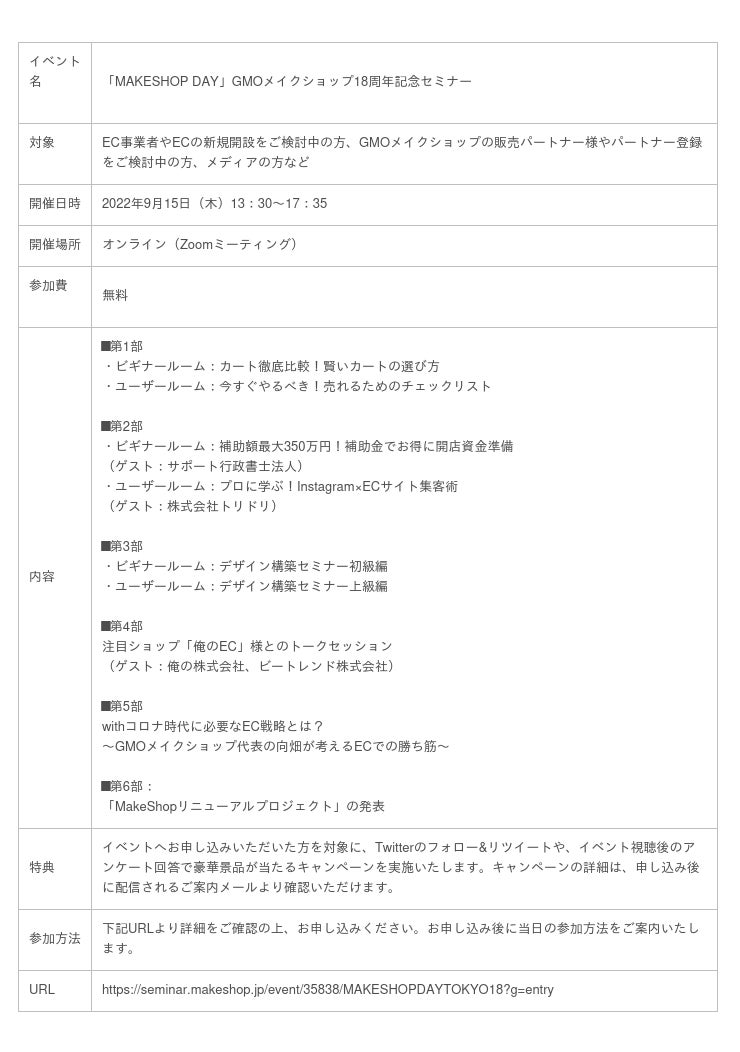 GMOインターネットグループのGMOメイクショップ株式会社(代表取締役社長:向畑 憲良 以下、GMOメイクショップ)は、2022年9月15日(木)に開催するオンラインイベント「MAKESHOP DAY」の参加者受付を開始いたしました。
