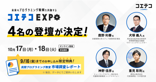 GMOインターネットグループのGMOメディア株式会社(代表取締役社長:森 輝幸 以下、GMOメディア)が運営するプログラミング教育ポータルサイト「コエテコ byGMO」が2022年10月17日(月)・18日(火)の2日間に渡り開催する、未来のプログラミング教育を共創するオンラインイベント『コエテコEXPO』において、業界のキーパーソン4名の登壇者が決定いたしました。