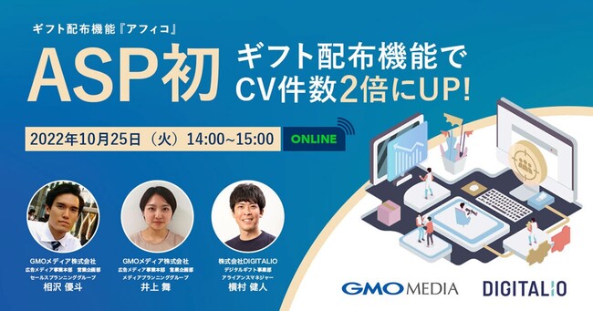 GMOインターネットグループのGMOメディア株式会社(代表取締役社長:森 輝幸 以下、GMOメディア)が運営する、アフィリエイトサービスプロバイダ(ASP)(※1)「アフィタウンbyGMO」は、株式会社DIGITALIO(以下、DIGITALIO)とアフィリエイト担当者を対象とした無料オンラインセミナーを2022年10月25日(火)に開催いたします。