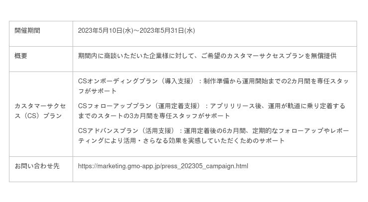 これを記念して、期間中にご商談をいただいた企業様に、ご希望のカスタマーサクセスプランを無償で提供するキャンペーンを実施いたします。初めてアプリ運用を行う店舗や、新任の担当者など販促の専門知識がない方でも、安心して制作から導入、導入後の活用までサポートを受けることができるプランです。この機会に、ぜひご活用ください。