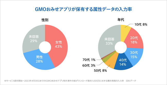 「GMOおみせアプリ」には、制作したアプリの総ダウンロード数に対して、性別や年代などの属性情報を入力するユーザーが約7割いるため、自社アプリのユーザーに対してそのデータを抽出した情報配信ができる環境が整備されています。