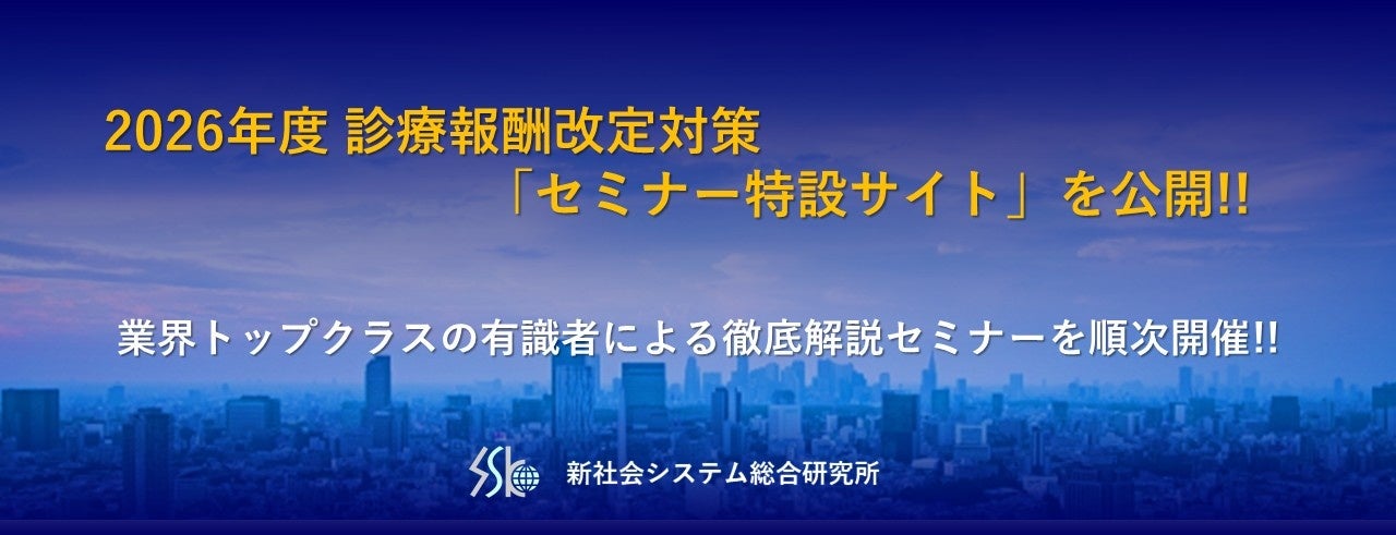 ビジネスセミナーを年間500回手掛ける株式会社新社会システム総合研究所(SSK)は、2026年度(令和8年度)診療報酬改定対策のため、「診療報酬改定セミナー特設サイト」を開設いたしました。医療業界のトップクラスの有識者を講師に迎え、病院関係者や製薬・ヘルスケア企業の担当者を対象に、激変する医療環境に勝ち抜くための具体的な方策を提示します。