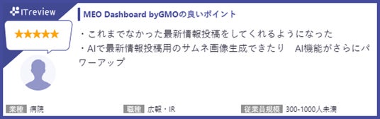 【「ITreview」に寄せられた『MEO Dashboard byGMO』利用者の声(一部抜粋)】■『MEO Dashboard byGMO』に関するレビュー URL: