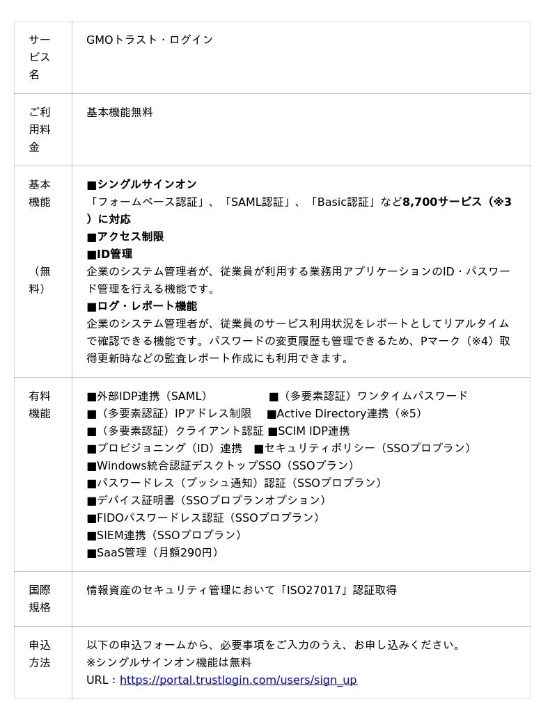 https://trustlogin.com/contact/brand/【「GMOトラスト・ログイン」について】(URL:https://trustlogin.com/) 「GMOトラスト・ログイン」は、総合満足度No.1(※2)に選ばれているIDを一元管理するクラウド型認証サービスです。SAML2.0のプロトコルに汎用的に対応したフェデレーション方式のシングルサインオンに加え、フェデレーション方式に非対応なWebシステムやクラウドサービスのIDパスワード情報の管理・代理入力実行によるログイン作業工数の削減が可能なフォームベース認証に対応しています。これらの複数のシングルサインオン方式に対応することで、「業務に関するシステムへのログイン」を広くカバーします。