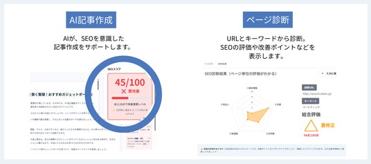 キーワードや記事ターゲット、セールスポイントなどを指定すると、AIが自動で記事を生成。SEOに最適化された記事構成で作成され、検索上位表示の可能性が高まる。SEOスコアとして記事の評価や点数も表示されるためSEOノウハウがなくても安心してライティングに取り組むことが可能。