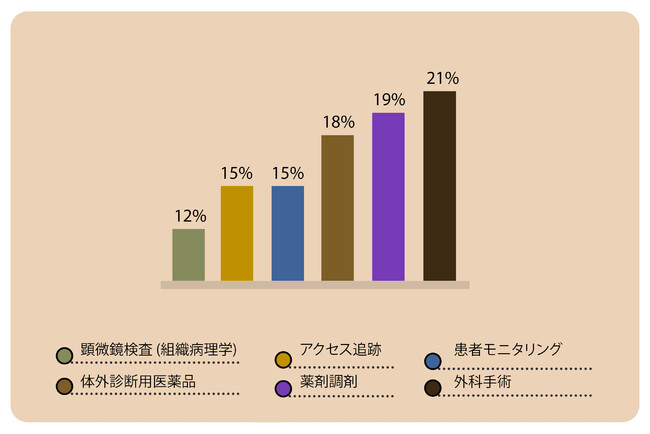 用途によって、体外診断、アクセス追跡、外科手術、患者モニタリング、顕微鏡検査 (組織病理学)、および薬物調剤に分類されます。 すべてのアプリケーションでほぼ均等な分布が見られましたが、外科手術は他のアプリケーションよりも有利です。