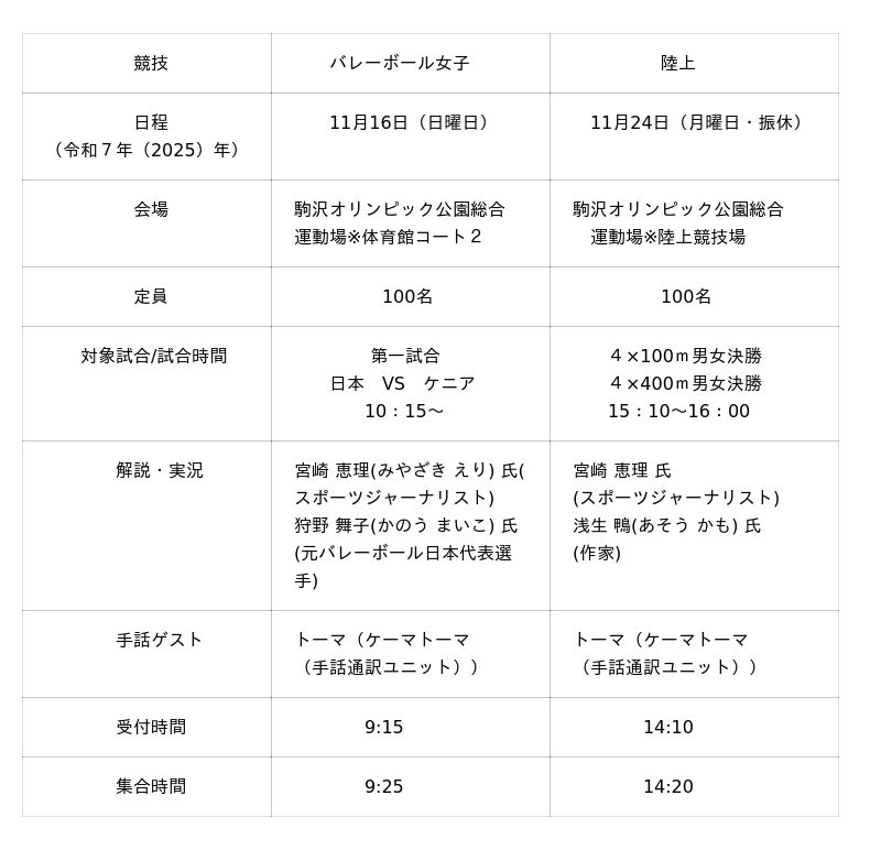 大会 東京2025」のバレーボール女子及び陸上の観戦会を実施します。スポーツジャーナリストや