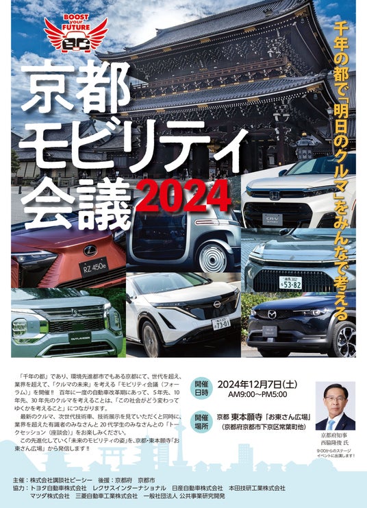イベントには各メーカー最新の次世代モビリティが並び、ステージイベントでは各社の次世代技術開発者、ジャーナリストとともに、西脇隆俊京都府知事も登壇(AM9~10時)します。
