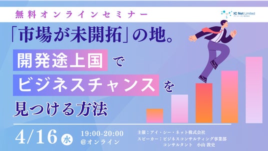 株式会社 学研ホールディングス(東京・品川/代表取締役社長:宮原博昭)のグループ会社、アイ・シー・ネット株式会社(埼玉・さいたま/代表取締役:百田顕児、以下、アイ・シー・ネット)は、これから海外進出をしようとしている方や社会貢献事業に取り組まれている方、今、話題のグローバルサウスに関心がある方など、情報収集やご自身の関心事の知見を広げるためのセミナーを2025年4月16日(水)にオンラインで開催します。