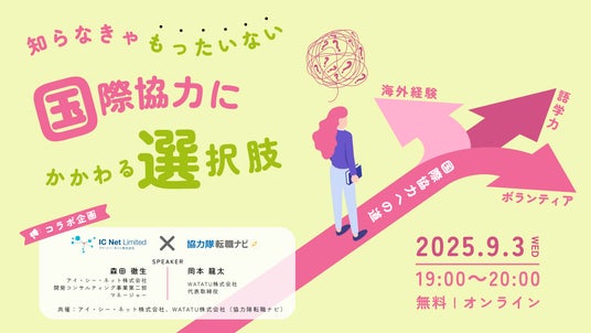 株式会社 学研ホールディングス(東京・品川/代表取締役社長:宮原博昭)のグループ会社、アイ・シー・ネット株式会社(埼玉・さいたま/代表取締役:百田顕児、以下、アイ・シー・ネット)は、JICAや経済産業省などの省庁のプロジェクトや、日本の民間企業の海外展開支援、開催中の大阪・関西万博のプロジェクトなど、開発途上国に関係する多様な事業に携わっています。「国際協力」と聞くと、限られた人だけがかかわるものと思われがちですが、実際には誰もがその一歩を踏み出すことができます。 そこで今回、国際協力にかかわる最初のきっかけを知っていただく機会として、無料オンラインセミナー「知らなきゃもったいない 国際協力に関わる選択肢」を2025年9月3日(水)に開催いたします。