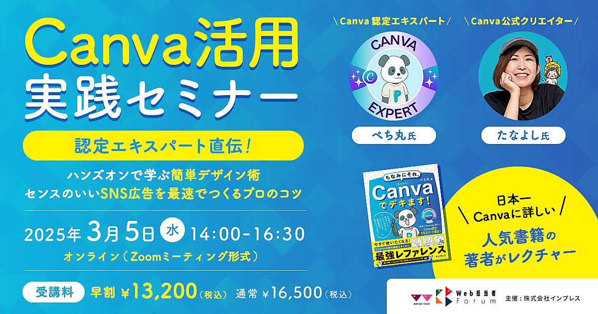 いま話題のオンラインデザインツール「Canva」を使って、魅力的なSNS広告デザインを短時間で作成するハンズオン型のセミナーを3月5日(水)14:00~16:30に開催します。インプレスの人気書籍「ちなみにそれ、Canvaでできます!」の著者でCanva認定エキスパートのぺち丸氏と、公式クリエイターのたなよし氏を講師に迎え、CanvaのテンプレートやAI機能を使ってSNS向けの素材デザインを最速・高品質で完成させるプロのコツを伝授していただきます。