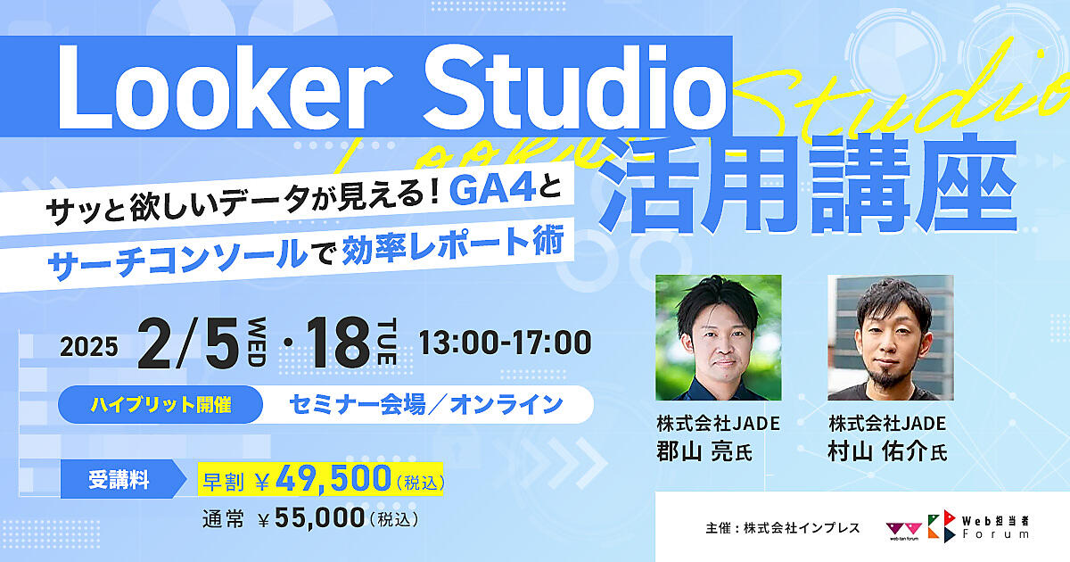 講師を担当するのは、アクセス解析領域のコンサルタントとしてWebマーケティングを支援する株式会社JADE(ジェイド)の郡山 亮氏と村山 佑介氏。Looker Studioをこれから本格体に使っていきたい方や導入されたばかりの方に向けて、2日間の講義で必須WebマーケティングツールでもあるLooker Studioを使いこなせるようにサポートしていきます。