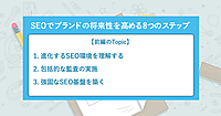 … ブランド強化に役立つSEOの8つのステップ を、前後編の2回にわけてお届けする。 SEOでブランドの将来性を高める8つのステップ … SEOでブランドの将来性を高める方法を知り、将来を見据えたSEOで競争力を身につけてブランド強化に繋げよう。 … SEOでブランドの将来性を高める8つのステップ(前編:進化するSEO環境の理解と強固な基盤構築) …