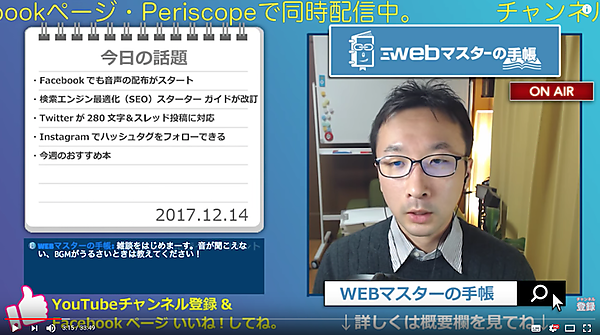 YouTubeライブ、Facebookライブ、Periscopeの3つで同時配信をしています。
