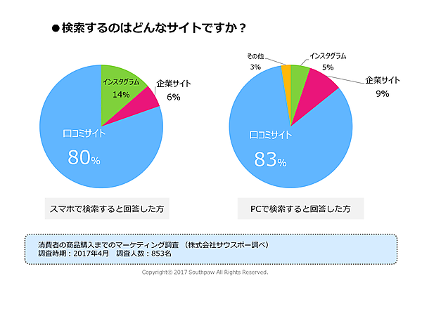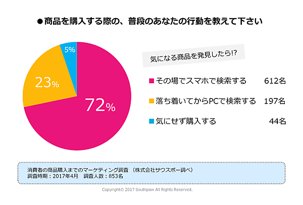 インターネットの普及により、店舗に買い物に行かなくてもインターネット経由で大抵のものは購入できるようになって来ました。しかし購入前にどんな商品なのかを知りたい時には、ネット上にある商品のクチコミが役立ちますね。現に、2017年に全国の10代~50代の女性853名を対象に「消費者の商品購入までのマーケティング調査」を取ったところ、気になる商品を見つけたら約95%の消費者がスマホやPC等で検索をしています。