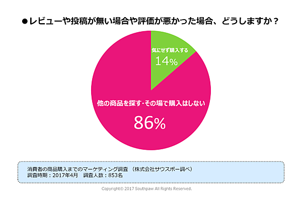 では、ここで質問です。検索したクチコミサイトで「レビューが全くない」「あってもクチコミが古い・評価が悪い」。そんな商品を目にした事はないでしょうか?このような場面に直面した際に、ユーザーはどのような行動を起こすのでしょうか?先程と同様、2017年に実施した「消費者による商品購入までの経緯に関するアンケート」によると、インターネットによる買い物をする際、購入希望の商品のクチコミ評価が著しく悪かったら、約8割の人が購入を見合わせるという意見があります。