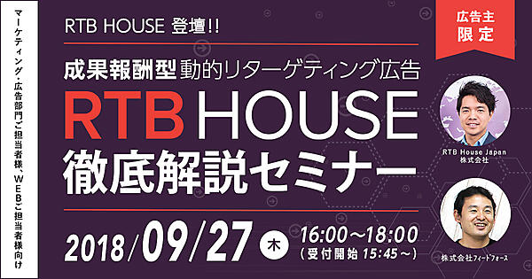 フィードフォースは、2018年9月27日(木)16:00~無料セミナー『RTB HOUSE登壇!成果報酬型動的リターゲティング広告「RTB HOUSE」徹底解説セミナー』を開催します。