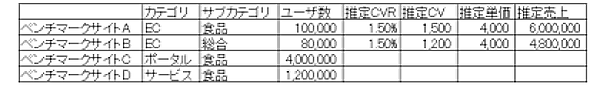 この表に書いているCVR(有料版のeMark+Proを使うとわかります)や推定単価は商品特性などから推測する必要がありますが、自社サイトを新規に作る以上仮説が必要で、まずはベンチマークとして決めておきましょう。