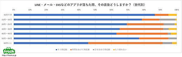 「LINE・メール・SNSなどのアプリが落ちた際、その直後どうしますか?」という質問を世代別に見てみました。