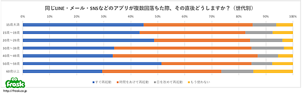 一方で、「同じLINE・メール・SNSなどのアプリが複数回落ちた際、その直後どうしますか?」という質問を世代別に見てみました。