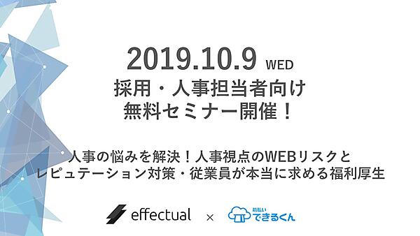Googleマイビジネスを活用した店舗の集客支援サービスを行う株式会社エフェクチュアル(本社:東京都港区、代表取締役:田中倫明)は、企業・従業員のための新型福利厚生 給与前払いシステム「前払いできるくん」を運営する株式会社Payment Technology(本社:東京都文京区、代表取締役:上野亨)と共同で、人事担当者向けの無料セミナーを2019年10月9日(水)に東京・新宿にて開催致します。