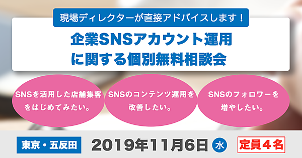 今回のテーマは「企業SNSアカウント運用に関する個別相談会」です。当日は、実際に企業のSNSアカウントの運用実績経験のある現場のディレクターがあなたのご相談にお答えいたします。