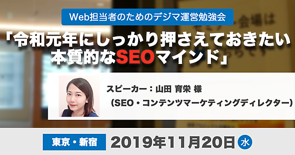| 17:00〜 | 「令和元年にしっかり押さえておきたい本質的なSEOマインド」 スピーカー:山田 育栄 様 SEO・コンテンツマーケティングディレクター |