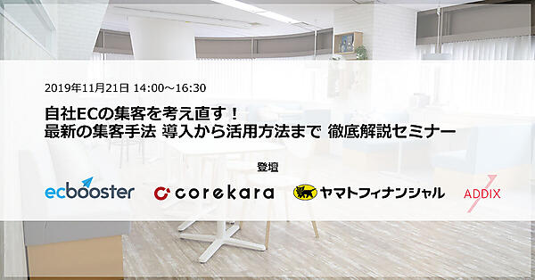 株式会社ADDIX(所在地:東京都千代田区、代表取締役:酒井大輔 以下、ADDIX)は株式会社フィードフォース、株式会社これから、ヤマトフィナンシャル株式会社との4社共催にて、通販事業の担当者を対象としたセミナー「自社ECの集客を考え直す!最新の集客手法 導入から活用方法まで 徹底解説セミナー」を、2019年11月21日(木)に開催いたします。