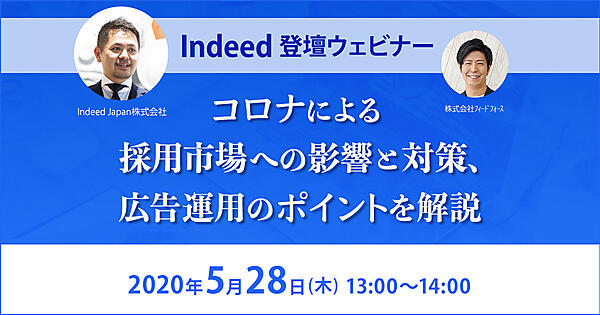 2020年5月28日(木)、Indeed Japan株式会社と株式会社フィードフォース共催で「Indeed登壇ウェビナー!コロナによる採用市場への影響と対策、広告運用のポイントを解説」を開催いたします。