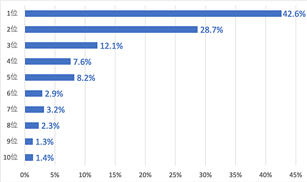 特に、1位のクリック率は42.6%と高い数値を示しています。また、上位3位までのクリック率の合計が83.4%であり、3位までに入ることの重要性がわかります。