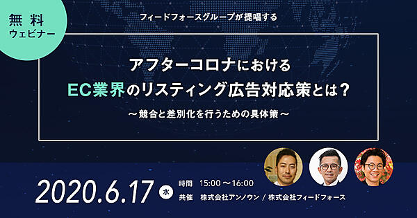 2020年6月17日(水)、株式会社アンノウンと株式会社フィードフォース共催で無料ウェビナー「フィードフォースグループが提唱する!アフターコロナにおけるEC業界のリスティング広告対応策とは?~競合と差別化を行うための具体策~」を開催いたします。