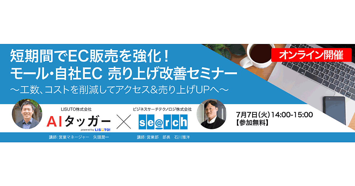 ビジネスサーチテクノロジ株式会社は、LISUTO株式会社と共同で、「短期間でEC販売を強化する!モール・自社EC 売り上げ改善」オンラインセミナーを2020年7月7日(火)に開催します。