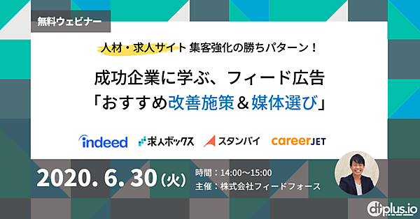 株式会社フィードフォースが提供する、マーケターのためのデータフィード管理ツール「dfplus.io」は、人材企業・求人サイト運営企業の集客強化を支援するためのウェビナーを2020年6月30日(火)に開催いたします。