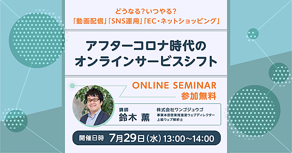 そんなアフターコロナ・ウィズコロナの今、ウェブサービス・オンラインで特に勢いのある「動画配信」「SNS運用」「EC・ネットショッピング」について業界動向・市場動向をウェブマーケティングの観点からご説明いたします。現在サービスの利用をご検討されている方や今お使いのサービスを比較ご検討されたい方、また第2波に備える環境準備で情報収集をなさっている方、ぜひご参加ください。