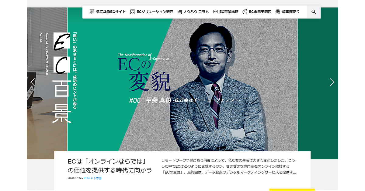 “おもてなしを科学する”株式会社イー・エージェンシー(東京都千代田区、代表取締役:甲斐 真樹、以下イー・エージェンシー)は、2020年7月14日(火)、ヤマトフィナンシャル株式会社が運営するECメディアサイト「EC百景」に、弊社代表のインタビュー記事が掲載されたことをお知らせいたします。