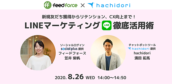 ソーシャルログイン・ID連携サービス「ソーシャルPLUS」を提供する株式会社フィードフォースは、LINE連携のチャットボット開発ツール「hachidori」を提供するhachidori株式会社との共催にて、『新規友だち獲得からリテンション、CX向上まで!LINEマーケティング徹底活用術』ウェビナーを、2020年8月26日(水)に開催いたします。