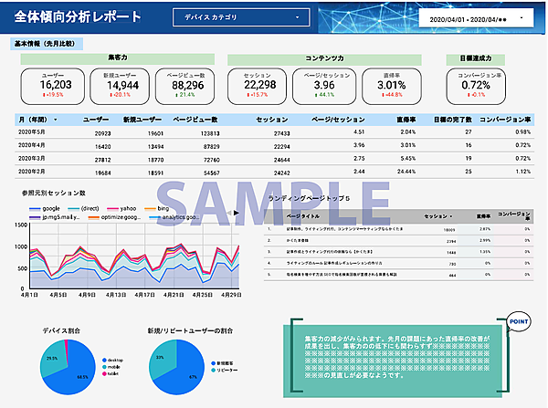 お客様自身でも確認できるGoogleアナリティクスやサーチコンソールなどの情報をわかりやすくまとめます。