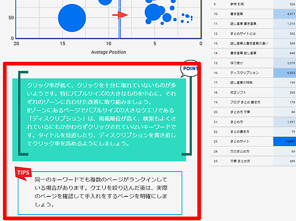 様々な角度から既存のコンテンツを分析し、リライトすべきページなど、コンテンツ制作に最適なアドバイスをします。