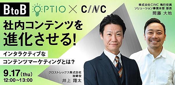 ・取得した個人情報については、共催2社(株式会社CINC、クロストレックス株式会社)においてイベントに関するお問い合わせならびに主催各社個別毎の今後のセミナー情報・商品情報などの告知のため共同利用させていただきます。
