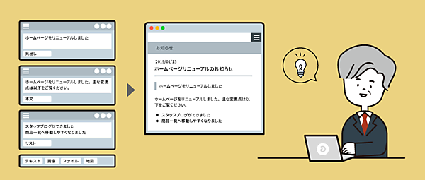 見出しや本文、箇条書きなどの区分けが明確になっているため、自然と文章構造を意識しながら記事を書くことができます。クライアントに更新のレクチャーをする際も、a-blog cms なら、いかに記事を作成しやすいかに重点を置いて伝えるようにしています。