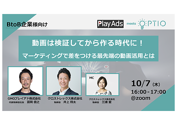 GMOプレイアド株式会社とクロストレックス株式会社は、 10/7(水)に共同でオンラインセミナー「動画は検証してから作る時代に!マーケティングで差をつける最先端の動画活用とは」を開催いたします。