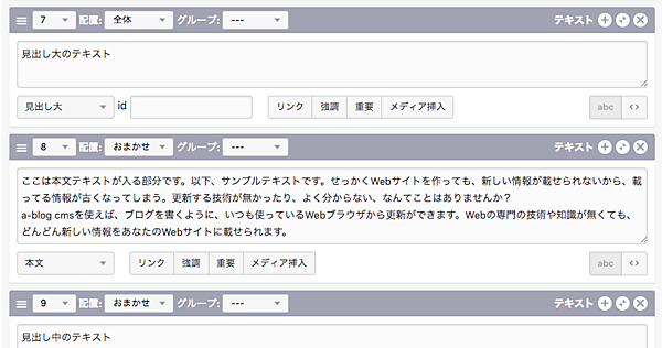 その点、a-blog cms なら、ユニット機能によりブロックを順番に積んでいく感覚で簡単に更新していくことができます。文章を書き慣れていない人でも、見出し→本文という構成に沿って記事を作成していけるため、意識せずに分かりやすい文章を書くことができるんです。書くことのハードルを下げ、何を伝えるかという本質的な部分に時間をかけられるのが a-blog cms なんです。