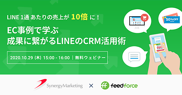 株式会社フィードフォースが提供するソーシャルログイン・ID連携サービス「ソーシャルPLUS」は、シナジーマーケティング株式会社との共催にて、「EC事例で学ぶ 成果に繋がるLINEのCRM活用術」と題したウェビナーを、2020年10月29日(木)に開催いたします。
