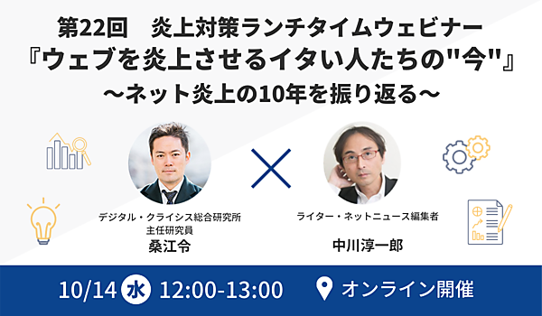 今回は、「『ウェブを炎上させるイタい人たちの“今”』 ~ネット炎上の10年を振り返る~」をテーマに、分析・解説いたします。匿名性が前提のネットはちょっとした感情の行き違いで「炎上」したり、相手が「クレーマー」になったりと粘着質な嫌がらせも起こります。「炎上がなぜ起こるのか」「炎上が起こる原因」について、過去10年間の炎上事例をもとに類型化し、わかりやすく説明いたします。また、ネットの罵倒で精神的に落ち込まないための解決法を盛り込みます。このセミナーを見れば、ネット依存症患者から身を守る方法がわかります。