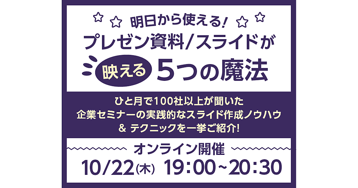 「わかりやすく」「見やすく」「響かせる」そんなプレゼン資料やスライドで発表ができたら・・・頭ではわかっていても、いざ作ろうと思うとなかなか難しいものです。徹夜をして時間をかけて作ったり、話したいこととずれてしまってうまく伝えられなかったり、、、そんなあなたにハロウィン目前、明日から使えるスライドの魔法が訪れる!?