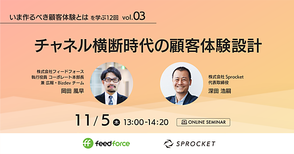 2020年11月5日(木)、株式会社Sprocket、株式会社フィードフォースの主催にて「チャネル横断時代の顧客体験設計」をテーマにしたウェビナーを開催いたします。