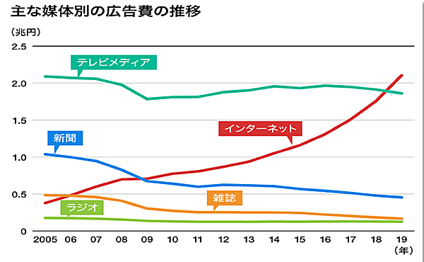 今まで主流だったマーケティング手法といえば、マス広告にCMを流し認知促進・ブランドイメージの向上を狙うことがほとんどでした。近年ではインターネット広告がマーケティングのメインとなり、広告費は年々上昇しています。このままいくと、インターネット広告費はどんどん上がり続けるでしょう。